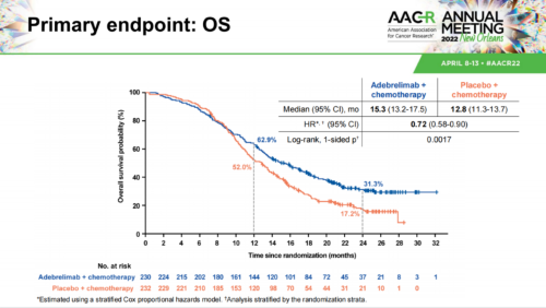 本次大会上口头报告的研究结果显示,中位随访时间13.5个月,阿得贝利单抗联合化疗组和安慰剂联合化疗组中位OS分别为15.3个月和12.8个月。1年OS率为62.9%vs52.0%,2年OS率为31.3%vs17.2%。独立评审委员会(IRC)评估的无进展生存期(PFS)为5.8个月vs5.6个月,6个月PFS率分别为49.4%和37.3%,12个月PFS率分别为19.7%和5.9%,ORR分别为70.4%和65.9%,DoR分别为5.6个月和4.6个月,目前显示获益趋势[8]